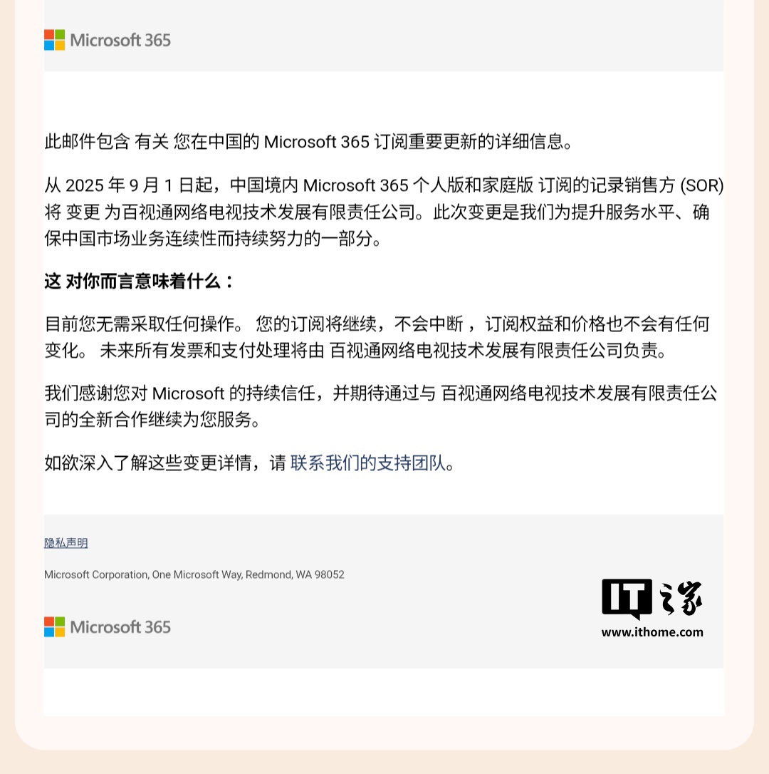 IT之家 8 月 24 日消息,微软 Microsoft 365 发布邮件,宣布自 2025 年 9 月 1 日起,中国大陆境内(国区)Microsoft 365 个人版和家庭版订阅的记录销售方将变更为“百视通网络电视技术发展有限责任公司”。