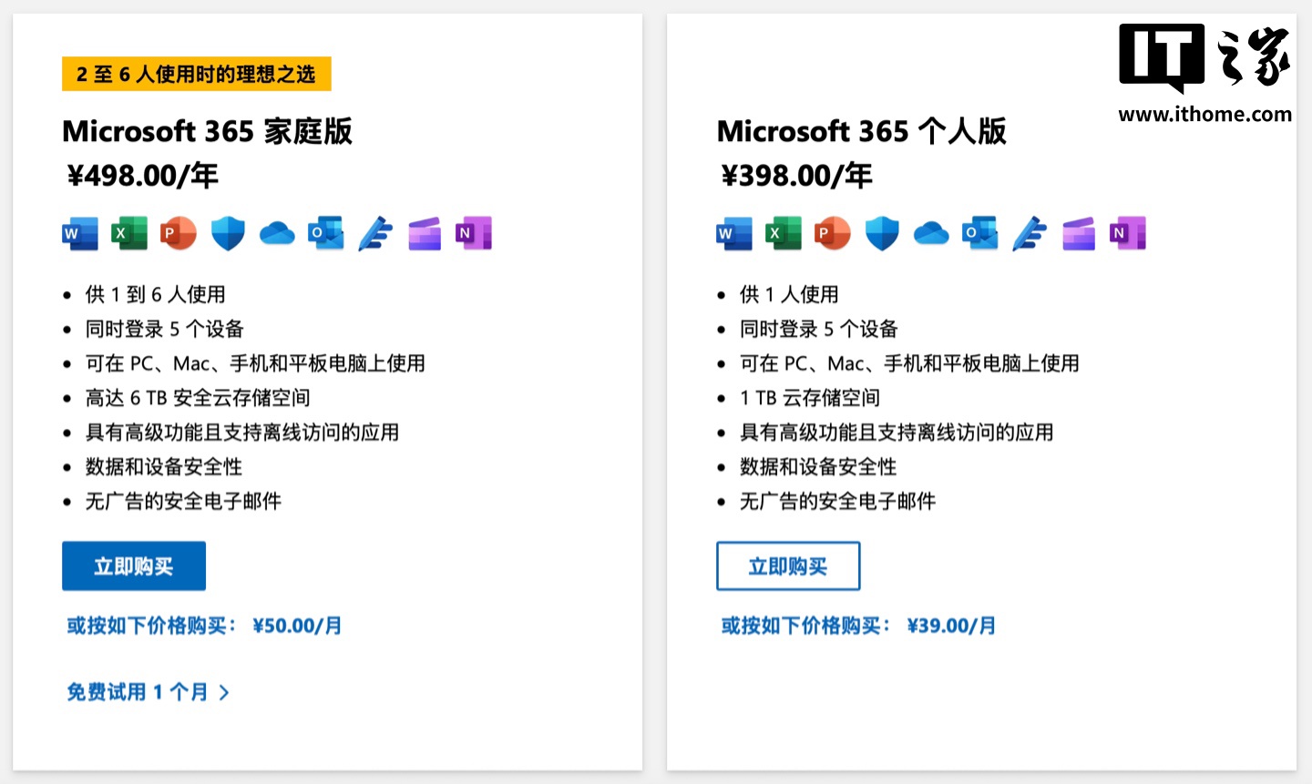 IT之家获悉,目前国区 Microsoft 365 个人版定价为 398 元 / 年或 39 元 / 月;而 Microsoft 365 家庭版定价为 498 元 / 年或者 50 元 / 月。